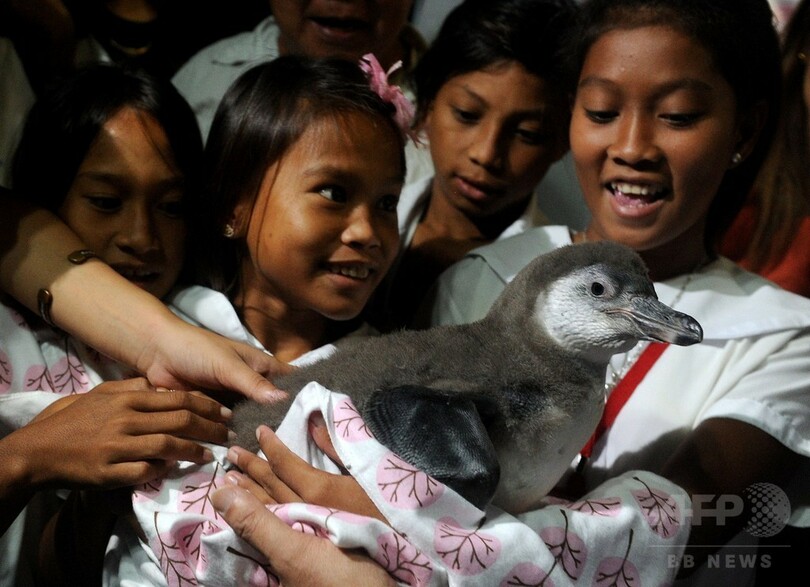美女に囲まれご満悦? フィリピンの赤ちゃんペンギン