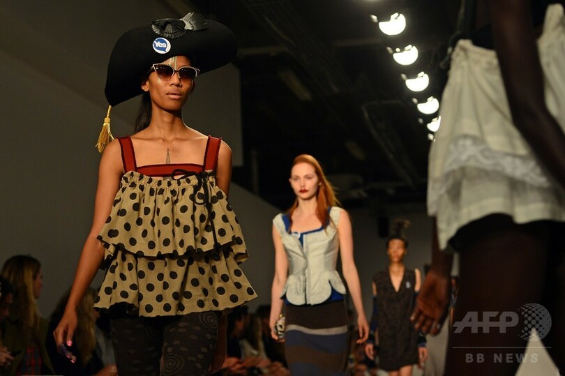 14日には、「ヴィヴィアン・ウエストウッド レッドレーベル(Vivienne Westwood Red Label)」が新作を発表した。(c)AFP