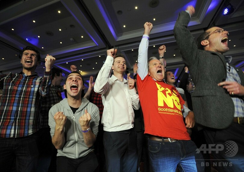 ニュース 政治・経済 スコットランド独立は否決、BBC速報 2014年9月19日 13:33 発信地:エディンバラ/英国 [ ヨーロッパ 英国 ] このニュースをシェア ‹ › ❮ 4/4 ❯ 英北部スコットランド(Scotland)のグラスゴー(Glasgow)で、開票結果に喜ぶ独立反対派の人々(2014年9月19日撮影)。(c)AFP/ANDY BUCHANAN 画像作成中 ! 【9月19日 AFP】18日投開票が行われた英北部スコットランド(Scotland)の独立の是非を問う住民投票は、19日早朝時点の英国放送協会(BBC)の開票速報によると、反対54.3%、賛成45.7%で否決される見込み。(c)AFP 政治・経済 一覧へ> メディア・報道関係・法人の方向け 写真・動画 購入のお問合せ>