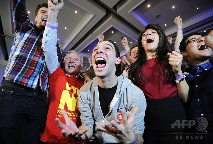 ニュース 政治・経済 スコットランド独立は否決、BBC速報 2014年9月19日 13:33 発信地:エディンバラ/英国 [ ヨーロッパ 英国 ] このニュースをシェア ‹ › ❮ 2/4 ❯ 英北部スコットランド(Scotland)のグラスゴー(Glasgow)で、開票結果に喜ぶ独立反対派の人々(2014年9月19日撮影)。(c)AFP/ANDY BUCHANAN 画像作成中 ! 【9月19日 AFP】18日投開票が行われた英北部スコットランド(Scotland)の独立の是非を問う住民投票は、19日早朝時点の英国放送協会(BBC)の開票速報によると、反対54.3%、賛成45.7%で否決される見込み。(c)AFP 政治・経済 一覧へ> メディア・報道関係・法人の方向け 写真・動画 購入のお問合せ>