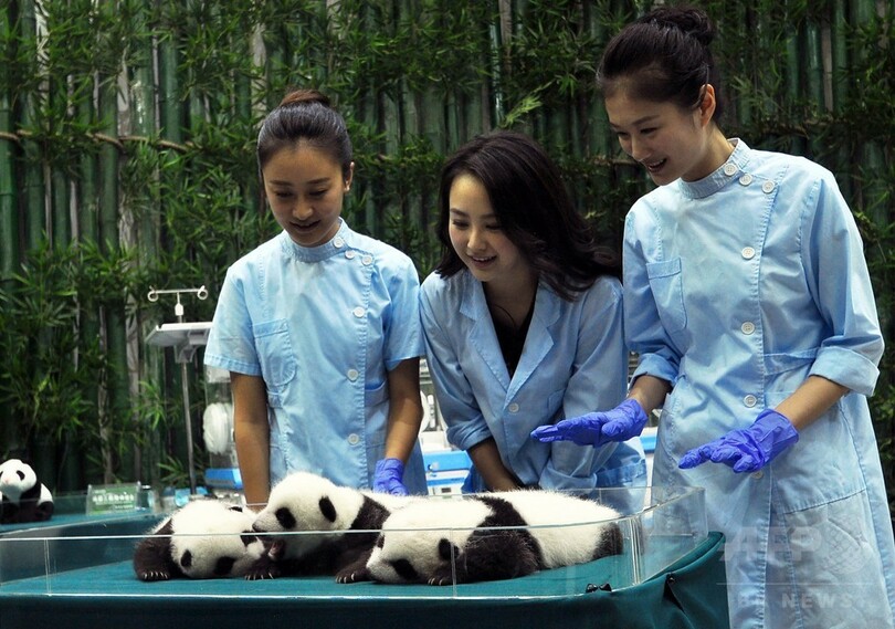 【9月19日 AFP】中国南部・広東(Guangdong)省広州(Guangzhou)の動物園「長隆野生動物世界(Chimelong Safari Park)」で7月末に誕生したジャイアントパンダの三つ子の赤ちゃんは、3匹とも順調に生育している。19日には、ミス・コンテスト参加女性たちが同園を訪れ三つ子たちと触れ合った。