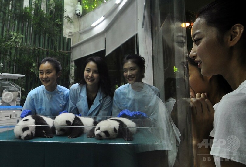 【9月19日 AFP】中国南部・広東(Guangdong)省広州(Guangzhou)の動物園「長隆野生動物世界(Chimelong Safari Park)」で7月末に誕生したジャイアントパンダの三つ子の赤ちゃんは、3匹とも順調に生育している。19日には、ミス・コンテスト参加女性たちが同園を訪れ三つ子たちと触れ合った。