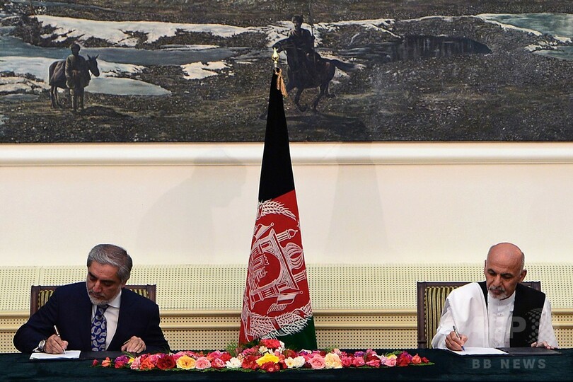 アフガニスタン大統領選は、決選投票に残ったガニ氏とアブドラ氏が選挙での不正をめぐり対立し、両者そろって勝利を宣言していたが、21日の選管による最終発表の数時間前に二人は挙国一致政権の樹立に向けた合意文書に署名し、混乱にようやく終止符が打たれた。両氏の得票数や投票者数などは公表されなかった。(c)AFP/Usman SHARIFI