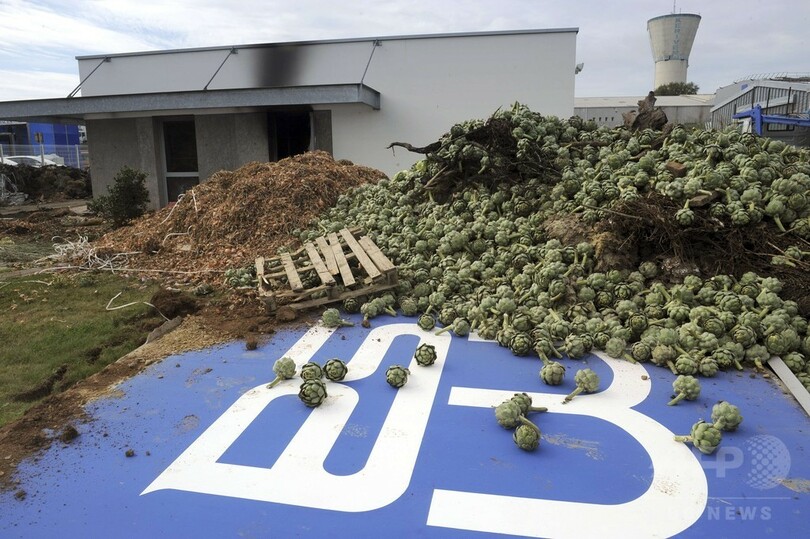 農民たちは数日前の20日にも同じブルターニュ地方のモルレー(Morlaix)で、農家向けの健康保険である農業社会共済(Mutualite sociale agricole、MSA)や税務署を放火し、大量のアーティチョークなどを積み上げる抗議行動を実施した。(c)AFP