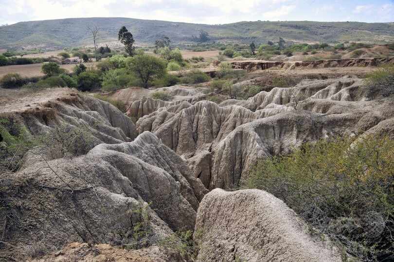 【9月24日 AFP】ボリビア南東部の町パディージャ(Padilla)近郊で、新生代などに生息していた古代生物の化石が風食作用により露出し、約70か所から出土している。これまでに甲羅に覆われた哺乳類グリプトドンの骨格や、ゾウに似た大型哺乳類マストドンの歯などが見つかっている。(c)AFP