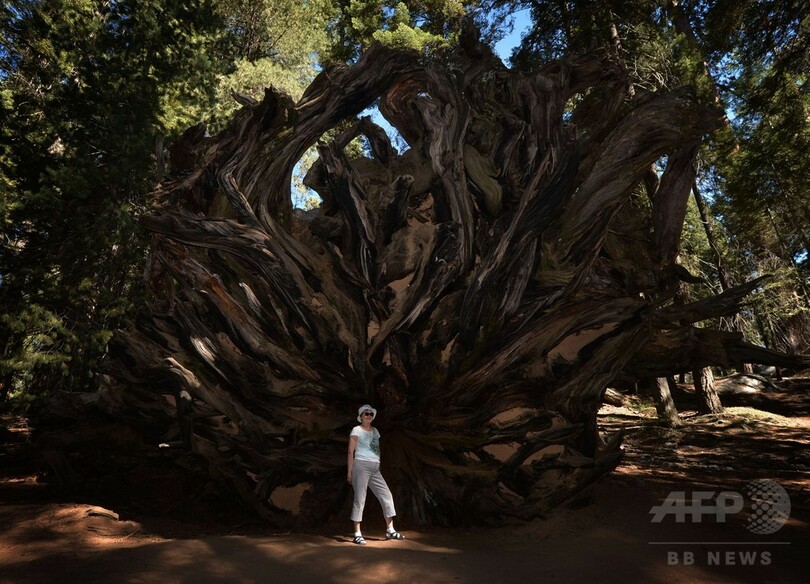 【9月26日 AFP】米カリフォルニア(California)州のセコイア国立公園(Sequoia National Park)で、倒れた巨大樹木セコイアの前で記念撮影する女性。セコイアは、減少する積雪と温暖化により危機にひんしていると指摘されている。(c)AFP