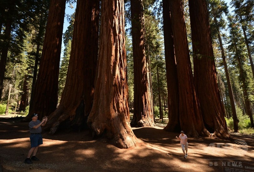 【9月26日 AFP】米カリフォルニア(California)州のセコイア国立公園(Sequoia National Park)で、倒れた巨大樹木セコイアの前で記念撮影する女性。セコイアは、減少する積雪と温暖化により危機にひんしていると指摘されている。(c)AFP