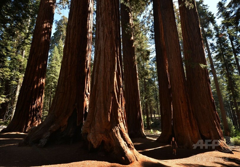 【9月26日 AFP】米カリフォルニア(California)州のセコイア国立公園(Sequoia National Park)で、倒れた巨大樹木セコイアの前で記念撮影する女性。セコイアは、減少する積雪と温暖化により危機にひんしていると指摘されている。(c)AFP