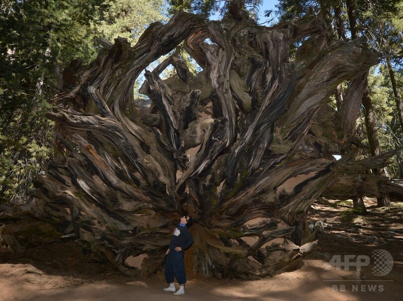 【9月26日 AFP】米カリフォルニア(California)州のセコイア国立公園(Sequoia National Park)で、倒れた巨大樹木セコイアの前で記念撮影する女性。セコイアは、減少する積雪と温暖化により危機にひんしていると指摘されている。(c)AFP