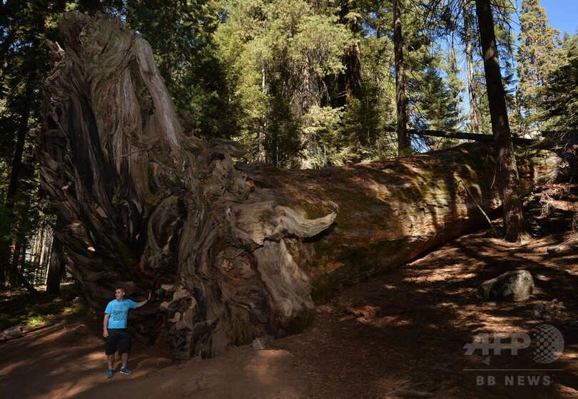 【9月26日 AFP】米カリフォルニア(California)州のセコイア国立公園(Sequoia National Park)で、倒れた巨大樹木セコイアの前で記念撮影する女性。セコイアは、減少する積雪と温暖化により危機にひんしていると指摘されている。(c)AFP