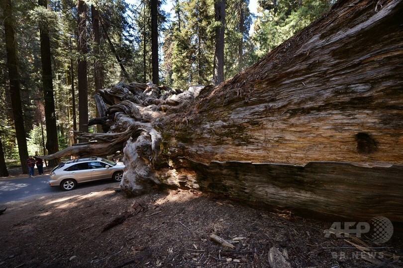 【9月26日 AFP】米カリフォルニア(California)州のセコイア国立公園(Sequoia National Park)で、倒れた巨大樹木セコイアの前で記念撮影する女性。セコイアは、減少する積雪と温暖化により危機にひんしていると指摘されている。(c)AFP