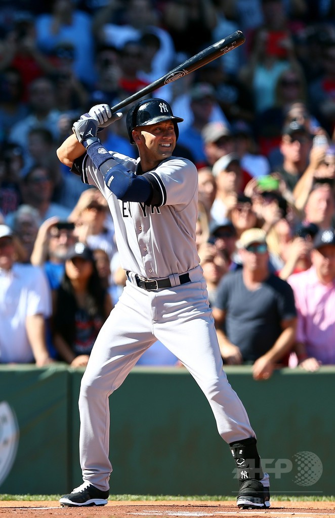 この日のジーターは内野安打を放って通算安打数を3464本に伸ばし、5回に2打数1安打でベンチに退いた。(c)AFP