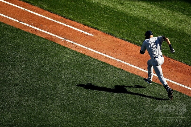 この日のジーターは内野安打を放って通算安打数を3464本に伸ばし、5回に2打数1安打でベンチに退いた。(c)AFP