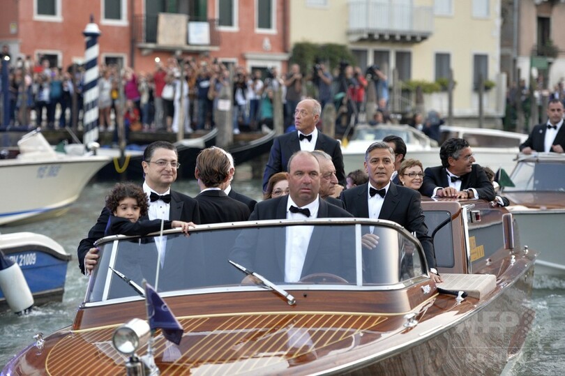 クルーニーさんは同日夕、約20人のパパラッチを引き連れ、ファンの声援を受けながら幸せいっぱいといった様子でベネチアの大運河(カナル・グランデ)を結婚パーティーの会場に向かった。何百ものカメラのフラッシュがクルーニーさんの周囲の水面に光を投げかけた。