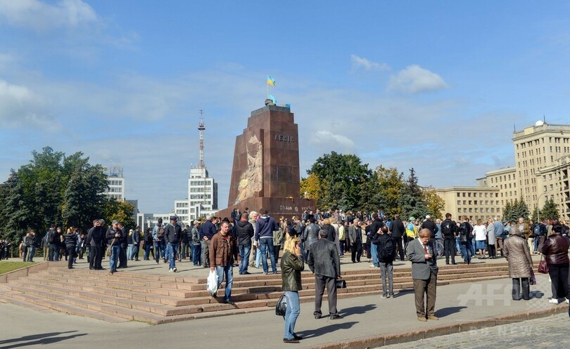 【9月30日 AFP】ウクライナ東部ハリコフ(Kharkiv)で28日夜、市内に立つロシア革命の指導者ウラジーミル・レーニン(Vladimir Lenin)の巨大像が、ウクライナ政府支持派の人々によって引き倒された。