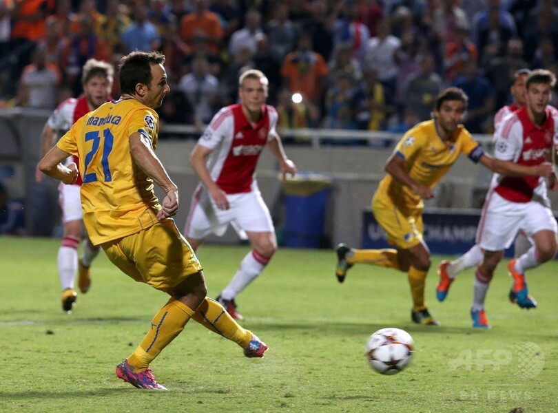 この結果、2試合連続で引き分けに終わったアヤックスは勝ち点2でグループ3位につけ、アポエルは勝ち点1で最下位となっている。(c)AFP