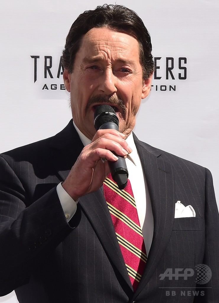 同地には、多くのハリウッドスターらの手型が刻まれているが、同日の式典に臨んだのは、映画『トランスフォーマー・ロストエイジ(Transformers: Age of Extinction)』でオプティマス・プライムの声優を務めたカナダ人のピーター・カレン(Peter Cullen)氏。(c)AFP