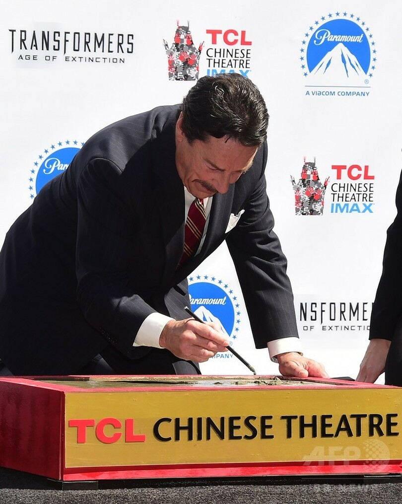 同地には、多くのハリウッドスターらの手型が刻まれているが、同日の式典に臨んだのは、映画『トランスフォーマー・ロストエイジ(Transformers: Age of Extinction)』でオプティマス・プライムの声優を務めたカナダ人のピーター・カレン(Peter Cullen)氏。(c)AFP