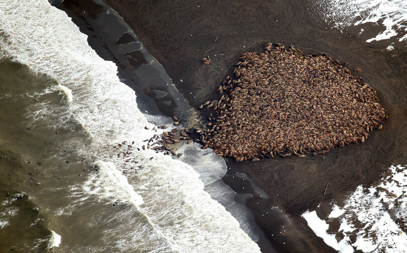 「北極海洋ほ乳類航空調査(Aerial Surveys of Arctic Marine Mammals)」プロジェクトに参加するミーガン・ファーガソン(Megan Ferguson)氏によると、セイウチの数は当初1か所の海岸に1500頭程度しかいなかったが、数日間で爆発的に増え、ほぼ24倍の3万5000頭になったと推定されている。