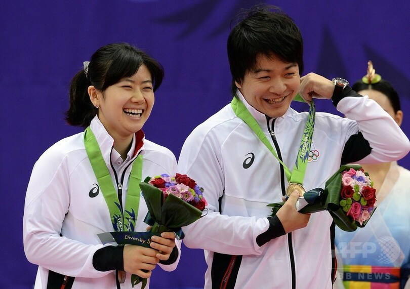 混合ダブルスでは岸川聖也(Seiya Kishikawa)/福原愛(Ai Fukuhara)組も銅メダルを獲得している。(c)AFP