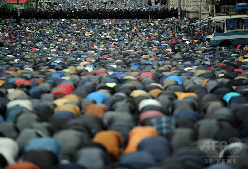【10月5日 AFP】ロシア・モスクワ(Moscow)で4日、イスラム教徒にとって重要な祭りの1つ、「犠牲祭(イード・アル・アドハ、Eid al-Adha)」を前にモスク周辺の路上にずらりと並んで祈りを捧げるイスラム教徒たちの姿が見られた。犠牲祭は、イスラム教徒がサウジアラビアの聖地メッカ(Mecca)に向かう大巡礼「ハッジ(Hajj)」の最終日から行われる。(c)AFP