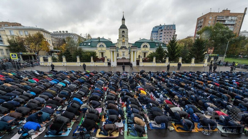 モスクの外で祈るイスラム教徒たち、モスクワ