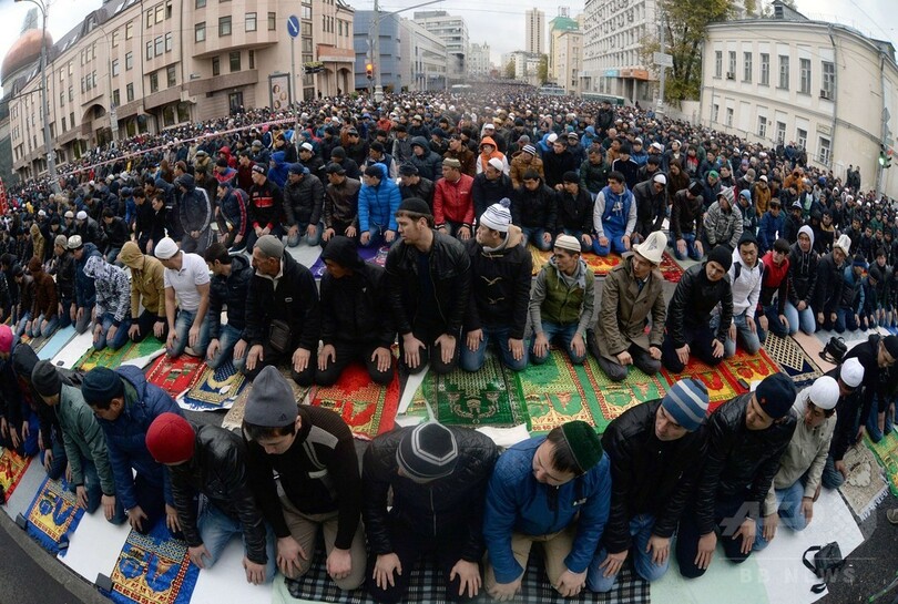 【10月5日 AFP】ロシア・モスクワ(Moscow)で4日、イスラム教徒にとって重要な祭りの1つ、「犠牲祭(イード・アル・アドハ、Eid al-Adha)」を前にモスク周辺の路上にずらりと並んで祈りを捧げるイスラム教徒たちの姿が見られた。犠牲祭は、イスラム教徒がサウジアラビアの聖地メッカ(Mecca)に向かう大巡礼「ハッジ(Hajj)」の最終日から行われる。(c)AFP