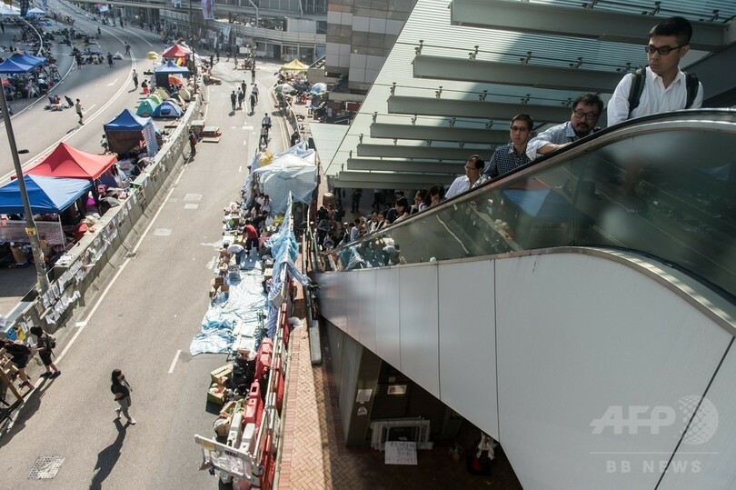 【10月6日 AFP】香港(Hong Kong)で6日、行政長官選挙の制度改革をめぐり政府庁舎周囲の道路を占拠していた民主派デモの参加者たちの多くが、政府によるデモ隊の強制排除を懸念し、道路から引き揚げた。香港中心部にある政府庁舎近辺ではデモ隊による道路封鎖で、1週間以上も都市機能がまひ状態に陥っていたが、封鎖解除により週明けには通常通り登庁する職員らの姿がみられた。