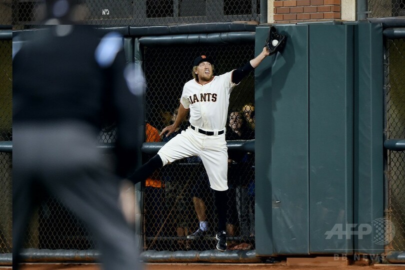 試合を振り出しに戻されたジャイアンツは7回裏、パニックとバスター・ポージー(Buster Posey)が連打し、ハンター・ペンス(Hunter Pence)の四球で満塁の場面を作ると、ナショナルズのアーロン・バレット(Aaron Barrett)の暴投で決勝点を挙げた。(c)AFP