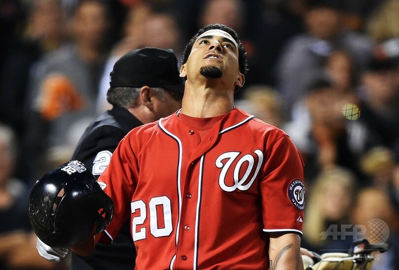 試合を振り出しに戻されたジャイアンツは7回裏、パニックとバスター・ポージー(Buster Posey)が連打し、ハンター・ペンス(Hunter Pence)の四球で満塁の場面を作ると、ナショナルズのアーロン・バレット(Aaron Barrett)の暴投で決勝点を挙げた。(c)AFP