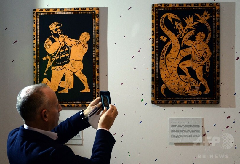 モスクワで開かれた展覧会は、クリミア(Crimea)半島のロシア領編入などを「ヘラクレスの12の功績」にたとえて、プーチン大統領をたたえる内容。一方、グロズヌイのパレードは、ロシアが支援するチェチェン共和国のラムザン・カディロフ(Ramzan Kadyrov)首長がプーチン大統領の肖像画を抱えて先導し、10万人以上がロシア国旗の色を表現しながら行進した。(c)AFP