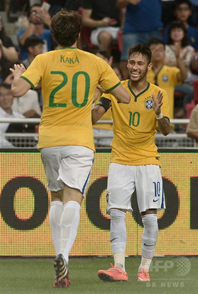 それから4分後、ネイマールは後半途中から投入されたカカ(Kaka)のクロスにファーサイドから走り込んで頭で合わせ、ブラジル代表での通算40得点目を記録している。