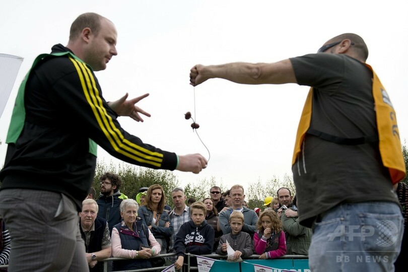 【10月13日 AFP】英イングランド(England)中部サウスウィック(Southwick)で12日、トチの実(トチノキの種子)をぶつけ合う英国伝統の秋の遊び「コンカース(Conkers)」の世界選手権が開催された。