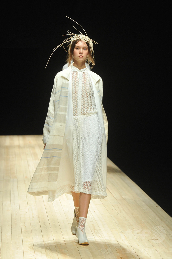 今シーズンのテーマは、「素(SHIRO)」。経年変化によって汚れてしまう「生成り」を、美しく表現したかったと掘畑。また今回、ろうけつ染め作家の中井由希子さんとのコラボレーションによって生まれたアイテムや、関口ようこさんとのコラボレーションによって生まれた生成り色のクラッチバッグやネックレス、ヘッドピースなども注目を浴びた。(c)MODE PRESS