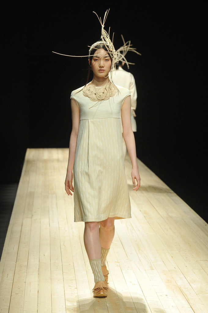 今シーズンのテーマは、「素(SHIRO)」。経年変化によって汚れてしまう「生成り」を、美しく表現したかったと掘畑。また今回、ろうけつ染め作家の中井由希子さんとのコラボレーションによって生まれたアイテムや、関口ようこさんとのコラボレーションによって生まれた生成り色のクラッチバッグやネックレス、ヘッドピースなども注目を浴びた。(c)MODE PRESS