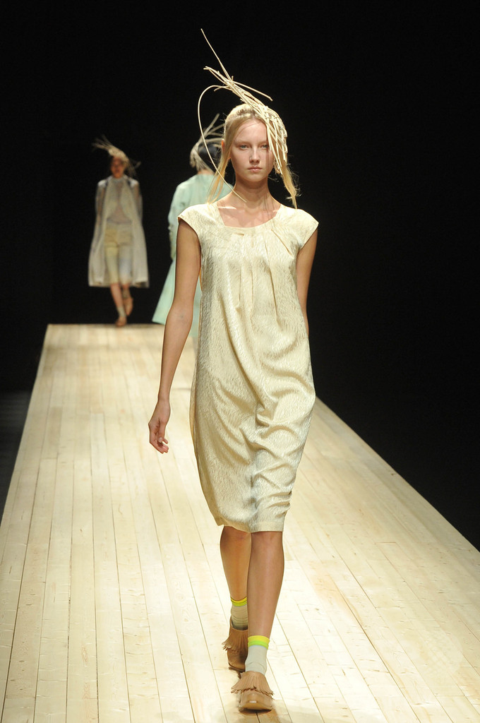 今シーズンのテーマは、「素(SHIRO)」。経年変化によって汚れてしまう「生成り」を、美しく表現したかったと掘畑。また今回、ろうけつ染め作家の中井由希子さんとのコラボレーションによって生まれたアイテムや、関口ようこさんとのコラボレーションによって生まれた生成り色のクラッチバッグやネックレス、ヘッドピースなども注目を浴びた。(c)MODE PRESS