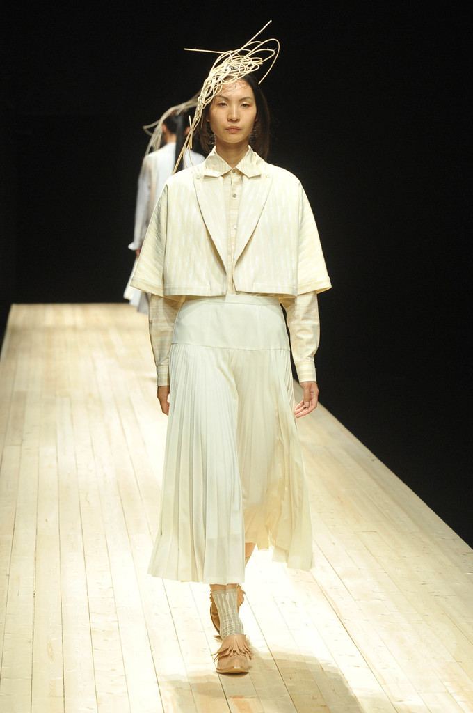 今シーズンのテーマは、「素(SHIRO)」。経年変化によって汚れてしまう「生成り」を、美しく表現したかったと掘畑。また今回、ろうけつ染め作家の中井由希子さんとのコラボレーションによって生まれたアイテムや、関口ようこさんとのコラボレーションによって生まれた生成り色のクラッチバッグやネックレス、ヘッドピースなども注目を浴びた。(c)MODE PRESS
