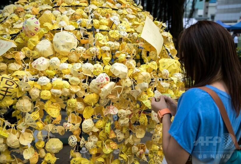 【10月15日 AFP】民主派デモが続く香港(Hong Kong)市内で飾りつけられる折り紙の傘。傘は「雨傘革命(Umbrella Revolution)」とも呼ばれるデモのシンボルとなっている。次期行政長官選挙をめぐり、中国政府から事実上の民主派排除の方針が示されたことがきっかけとなり、香港は1997年の英国から中国への返還以降、最悪の政治的危機に陥っている。(c)AFP