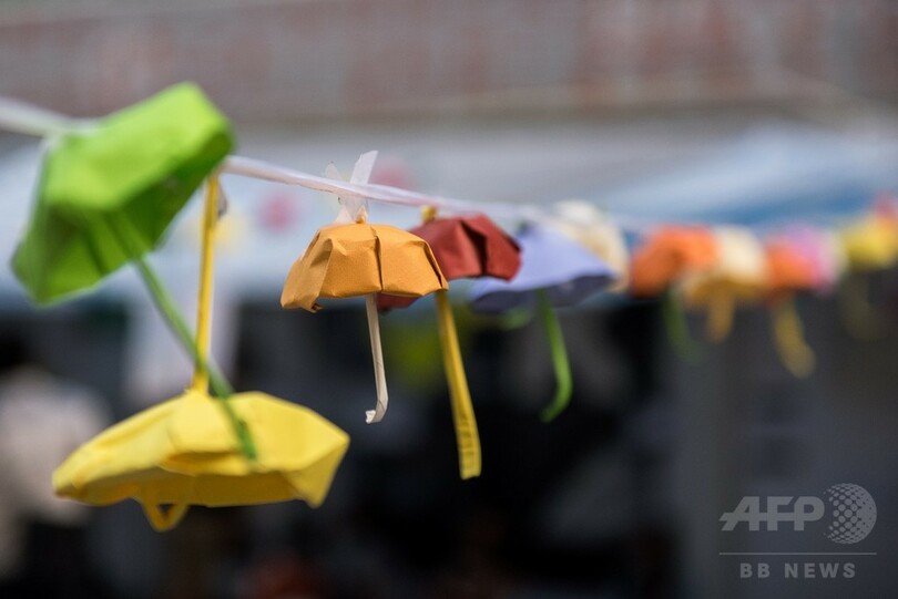 【10月15日 AFP】民主派デモが続く香港(Hong Kong)市内で飾りつけられる折り紙の傘。傘は「雨傘革命(Umbrella Revolution)」とも呼ばれるデモのシンボルとなっている。次期行政長官選挙をめぐり、中国政府から事実上の民主派排除の方針が示されたことがきっかけとなり、香港は1997年の英国から中国への返還以降、最悪の政治的危機に陥っている。(c)AFP