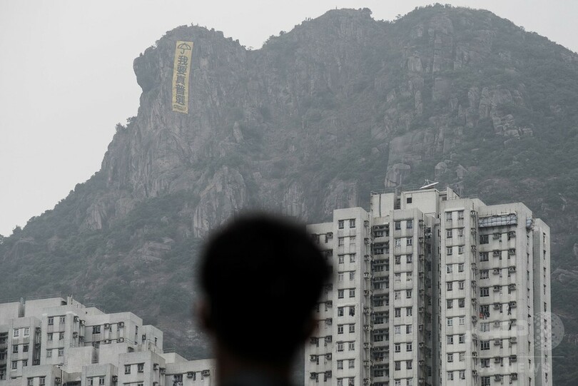 【10月24日 AFP】民主的な行政長官選挙の実施を求め民主派の学生らによる道路占拠が続く香港(Hong Kong)で23日、九龍(Kowloon)側の名所、獅子山(ライオンロック、Lion Rock)から「我要真普選(真の普通選挙を求める)」と書かれた巨大な垂れ幕が下ろされた。垂れ幕の長さは28メートル。