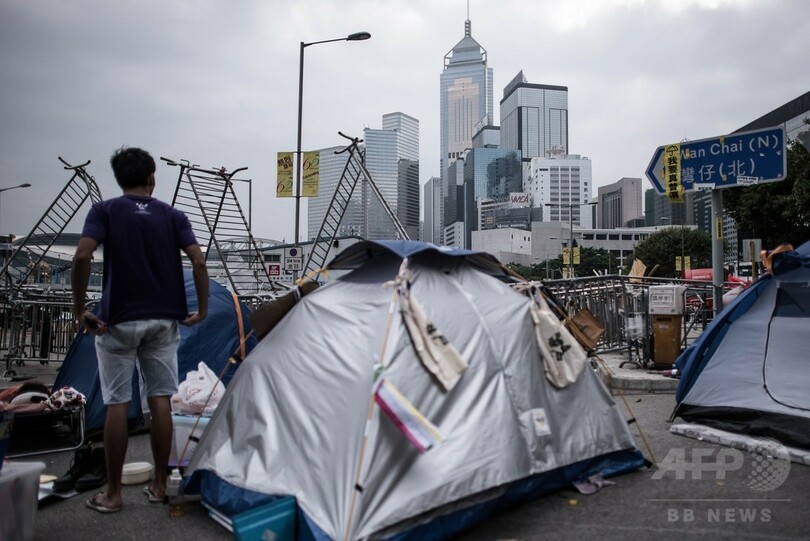 この状況を通じ、香港の梁振英(Leung Chun-ying)行政長官の支持率は急落している。香港中文大学(Chinese University of Hong Kong)が行った最新の調査によると、梁長官に対する評価は0~100までの評価スケールで38.6ポイントにとどまり、12年の就任以来最低に落ち込んでいる。(c)AFP/Jerome TAYLOR
