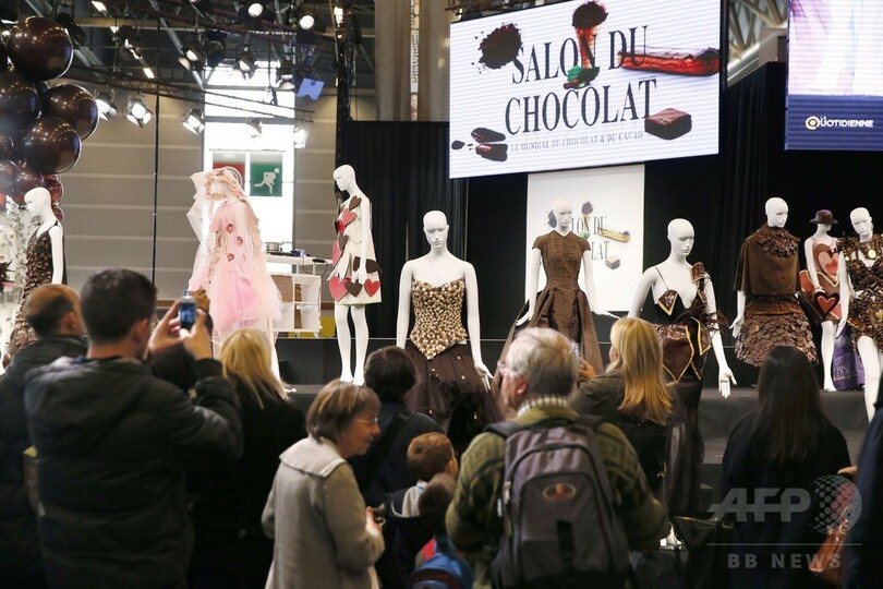 【10月30日 AFP】仏パリ(Paris)で29日、チョコレートの祭典「サロン・デュ・ショコラ(Salon du Chocolat)」が始まった。会場には、チョコレートで作られたエッフェル塔(Eiffel Tower)やフィギュアなど、さまざまな作品が展示されている。28日にはファッションショーも開催され、チョコレートでできたコスチュームが披露された。会期は11月2日まで。(c)AFP