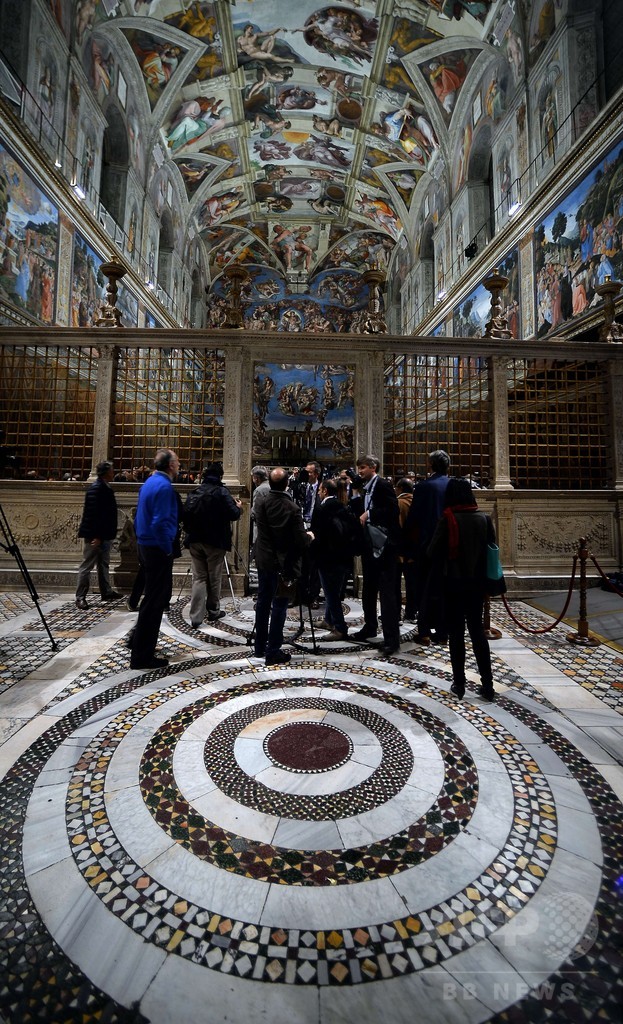 LEDの導入で、ミケランジェロ(Michelangelo)のフレスコ画「最後の審判(Last Judgment)」などにより彩られた礼拝堂内部をより鮮明に見ることができるようになった。15世紀から新法王を選出するための「コンクラーベ」の会場にもなっているこの礼拝堂には、年間約600万人が訪れている。バチカン市国によると、今後は礼拝堂への入場制限を設ける予定だという。(c)AFP