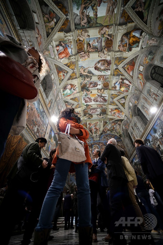 LEDの導入で、ミケランジェロ(Michelangelo)のフレスコ画「最後の審判(Last Judgment)」などにより彩られた礼拝堂内部をより鮮明に見ることができるようになった。15世紀から新法王を選出するための「コンクラーベ」の会場にもなっているこの礼拝堂には、年間約600万人が訪れている。バチカン市国によると、今後は礼拝堂への入場制限を設ける予定だという。(c)AFP