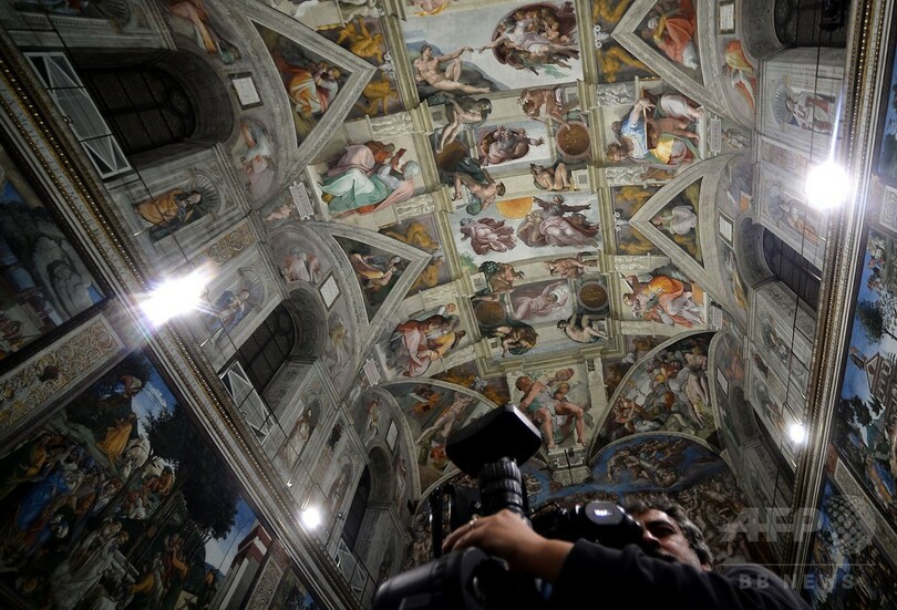 LEDの導入で、ミケランジェロ(Michelangelo)のフレスコ画「最後の審判(Last Judgment)」などにより彩られた礼拝堂内部をより鮮明に見ることができるようになった。15世紀から新法王を選出するための「コンクラーベ」の会場にもなっているこの礼拝堂には、年間約600万人が訪れている。バチカン市国によると、今後は礼拝堂への入場制限を設ける予定だという。(c)AFP