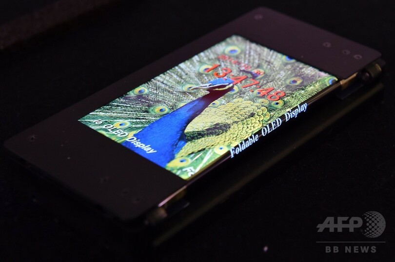 【11月1日 AFP】日本のハイテクベンチャー企業、半導体エネルギー研究所(Semiconductor Energy Laboratory)は10月29~30日に横浜市で開催された「Display Innovation 2014」で、折り畳み可能な5.9インチの有機ELディスプレー「Foldable Display」を展示した。10万回以上の折り畳みに耐えることができ、タッチパネル機能も備えている。(c)AFP