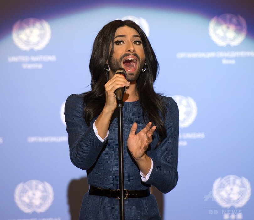 【11月4日 AFP】今年の欧州国別対抗歌謡祭「ユーロビジョン・ソング・コンテスト(Eurovision Song Contest)」で優勝したオーストリアの「ひげ面の女装歌手」、コンチータ・ウルスト(Conchita Wurst)さんが3日、同国の首都ウィーン(Vienna)の国連(UN)施設で、潘基文(バン・キムン、Ban Ki-moon)事務総長や数百人の国連職員を前に歌声を披露した。