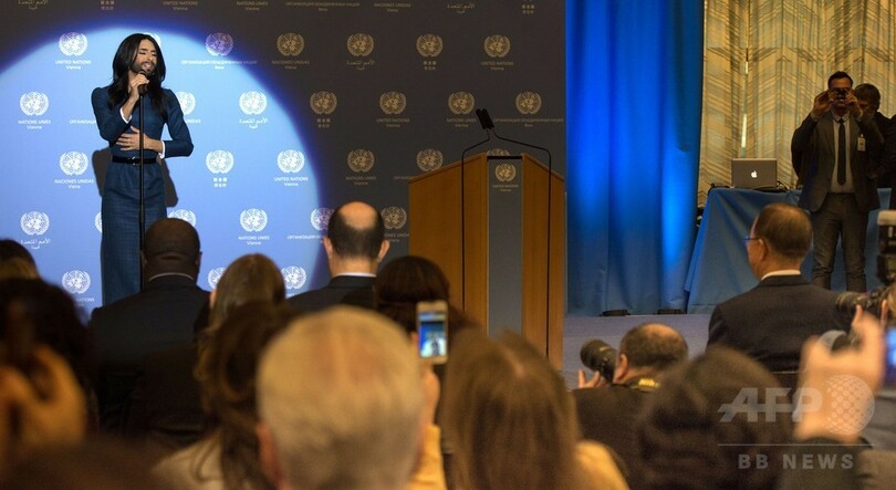 潘事務総長はウルストさんの活動を称え、自身もトランスジェンダーや同性愛者への偏見と闘っていくと語った。(c)AFP