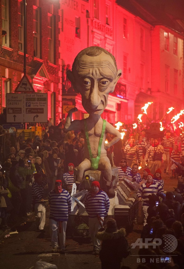 【11月6日 AFP】英イングランド(England)南東部イースト・サセックス(East Sussex)州ルイス(Lewes)で5日、伝統の祭り「ボンファイア・ナイト(Bonfire Night)」が開催され、パンツ一丁のウラジーミル・プーチン(Vladimir Putin)露大統領の人形が火に投げ込まれた。