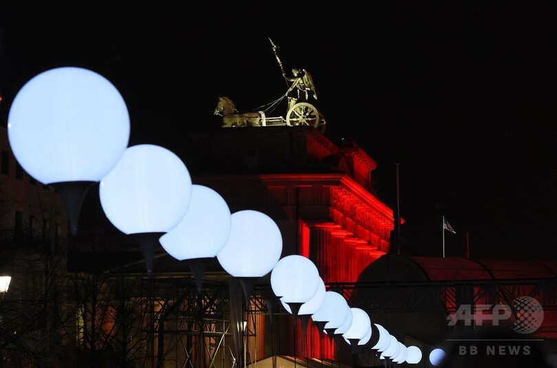 かつてベルリンの壁が巡らされていた155キロメートルのうち15キロメートルにわたって7000個近くの白い風船を地面に固定し、周囲が薄暗い中でドラマチックに照明するという、「リヒトグレンツェ(Lichtgrenze、光の境界)」と題された野心的なインスタレーションも作られた。上から見ると真珠が連なっているように見えるたくさんの輝く球体は9日に空に放たれ、ベートーベン(Ludwig van Beethoven)の「歓喜の歌(Ode to Joy)」が流れるなか夜空に浮かぶことになっている。(c)AFP/Deborah COLE